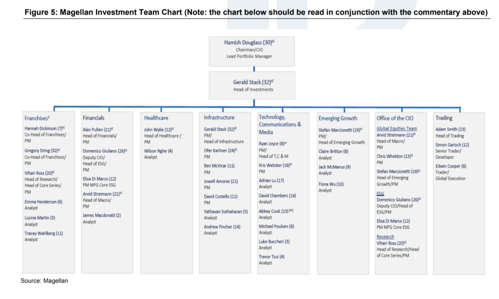 Anyway, so now to the relatively flat structure of the investment team at the Magellan Global Equities Fund (apologies for the blurry chart below but you get the gist). Hamish Douglass led the team and the vertical nature of the chart would suggest to me that ultimately he made the final call on the positions without being challenged by a parallel who would be adjacent at his level in the org chart.