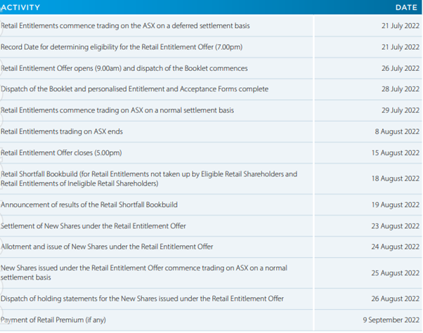 Option 3: Do nothing. In this case your entitlements will be sold through the retail shortfall bookbuild process, which will occur on 18 August 2022. Although you will likely get close to the intrinsic value of the entitlement at this date, there is NO GUARANTEE you will receive any value for the entitlements sold through the shortfall bookbuild. Any premium received during this process will be paid to you on or about 9 September 2022.